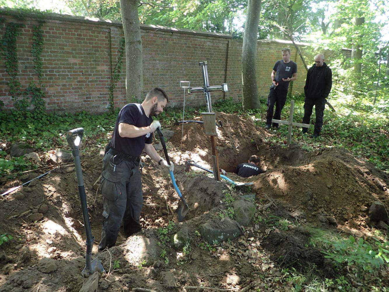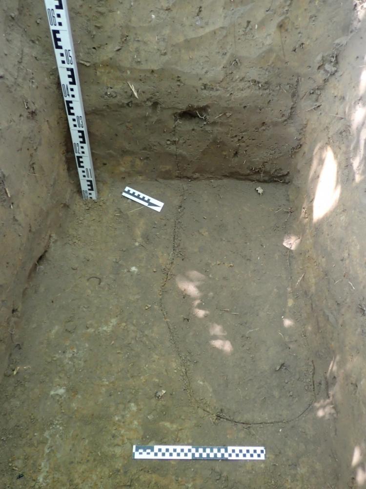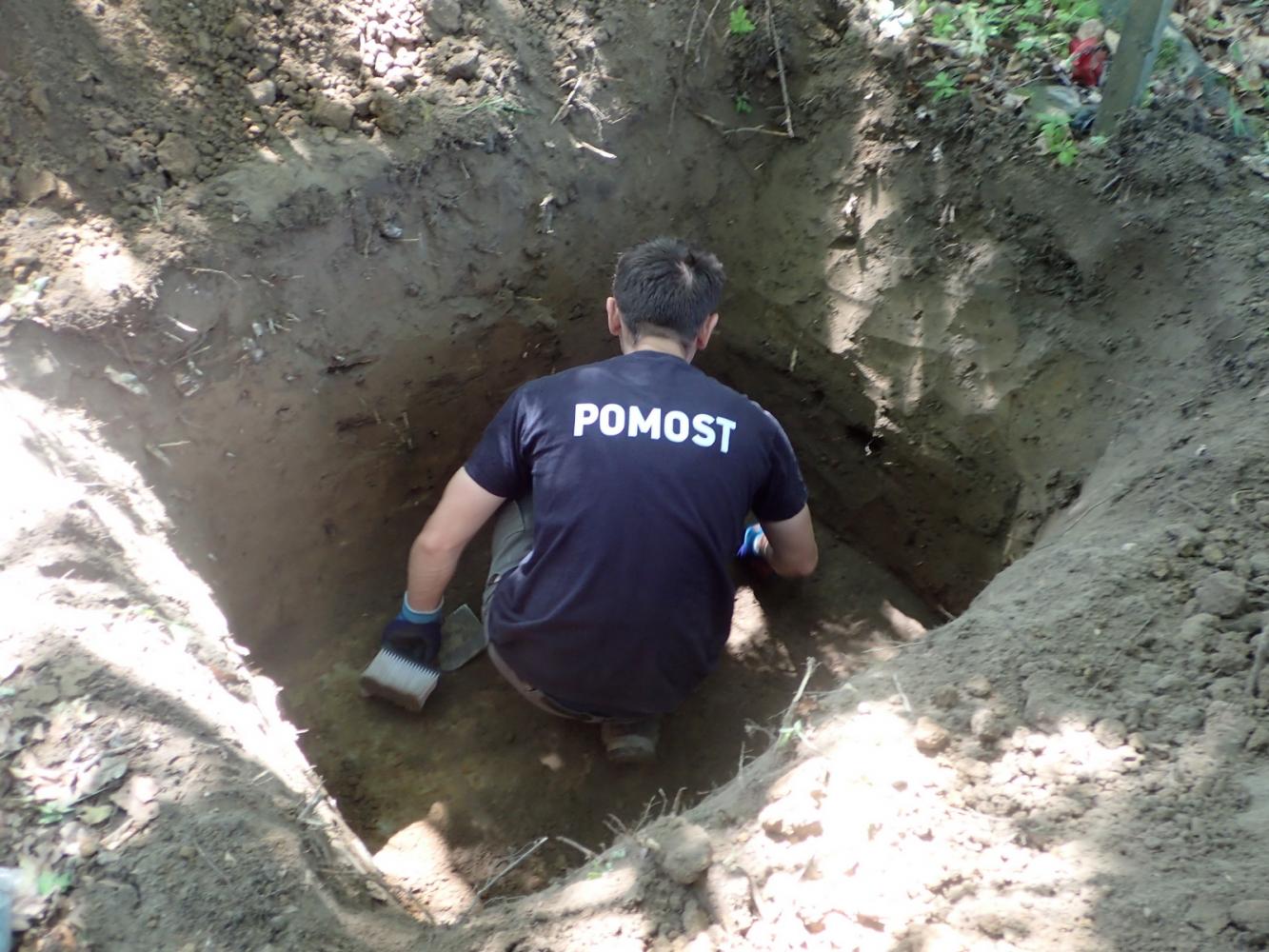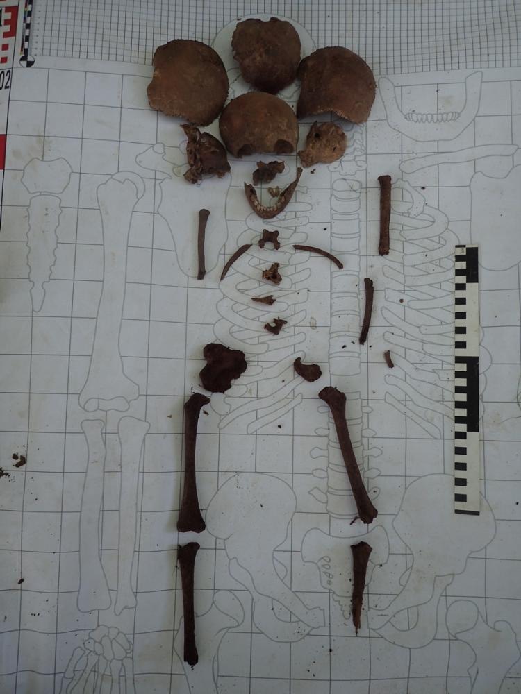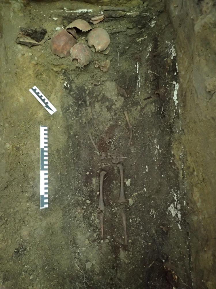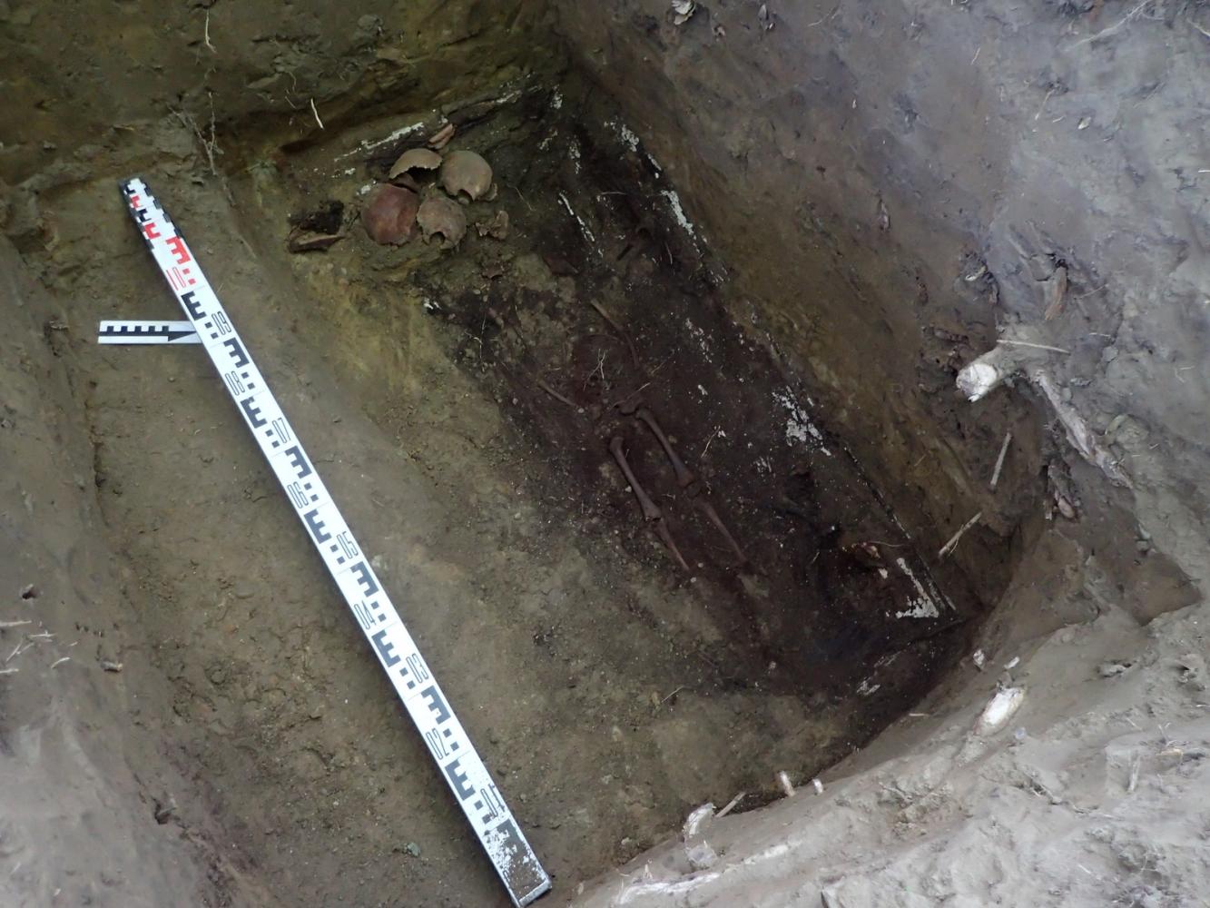 Nasze badania w jednym przypadku nie potwierdziły pochówku, natomiast w drugim natrafiliśmy na jamę grobową. Jej eksploracja doprowadziła do odkrycia pozostałości drewnianej trumny, w której spoczywały szczątki dziecka. Niestety z powodu złego stanu zachowania szkieletu i wkopu rabunkowego naruszającego pierwotny układ pochówku nie byliśmy w stanie określić płci dziecka, ani przyczyny jego śmierci. Miało ono zaledwie kilka lat. Świadczą o tym mleczne zęby i rozmiar kości. Ze względu na swój wiek dziecko to na pewno nie znało świata bez wojny. Nie wiemy czy zmarło ono w wyniku ran, chorób lub głodu. Pewne jest jednak, że zapłaciło życiem za decyzje dorosłych.