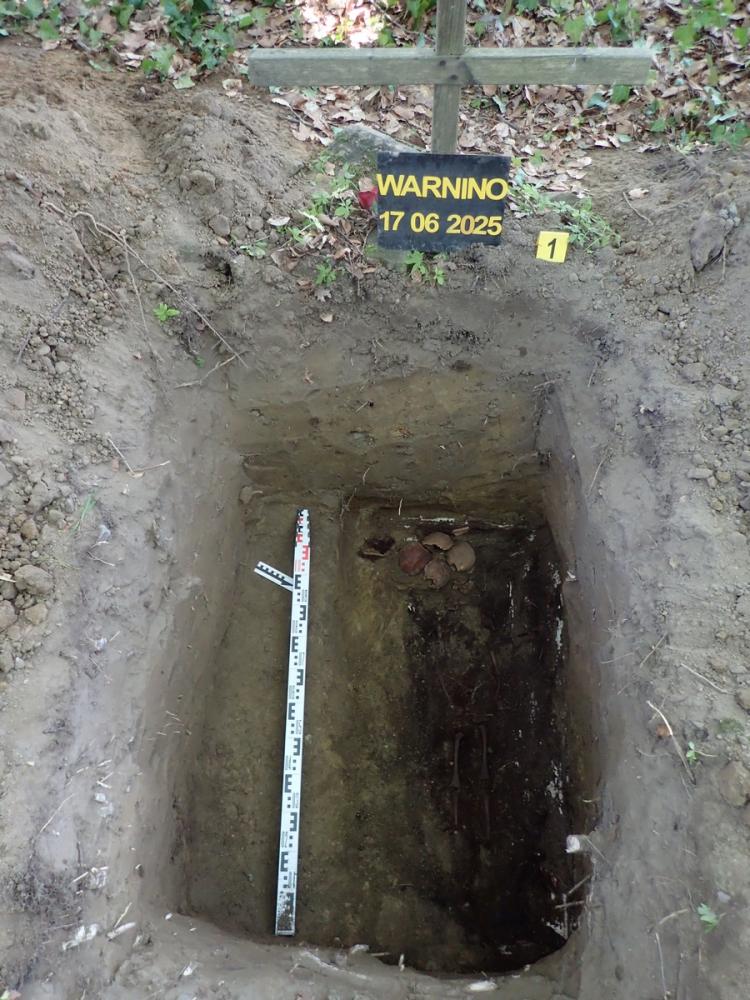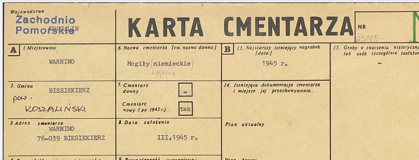 W trakcie kwerendy w Archiwum Państwowym w Koszalinie natrafiliśmy na kartę cmentarza informującą o niemieckich grobach wojennych z marca 1945 roku w Warninie. Wizja lokalna potwierdziła istnienie dwóch oznaczonych mogił w parku przy dawnym majątku ziemskim.