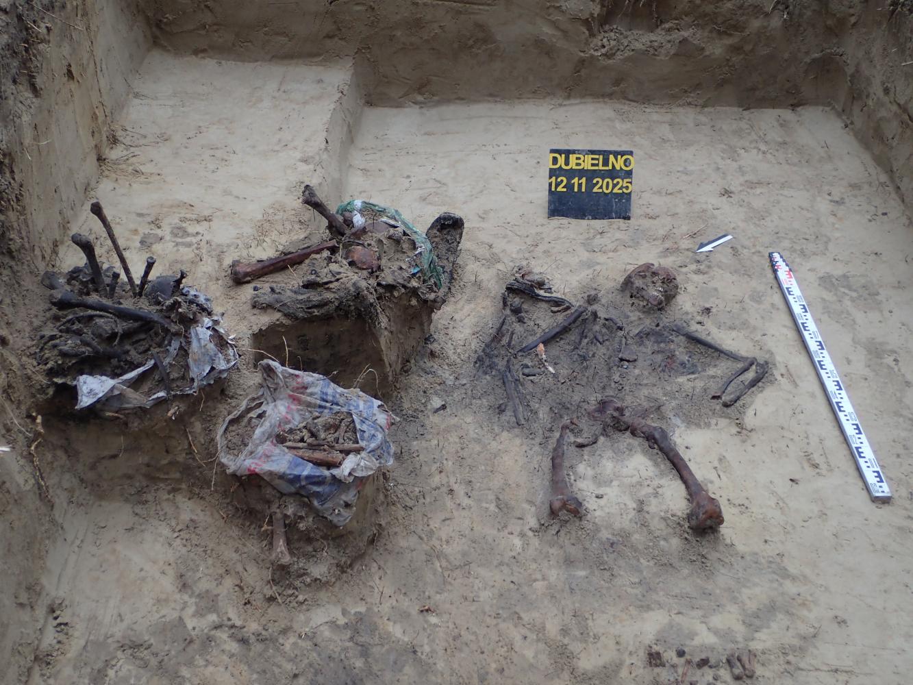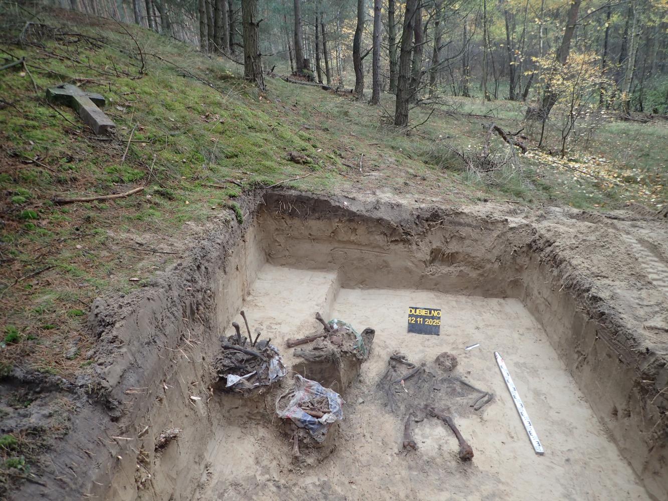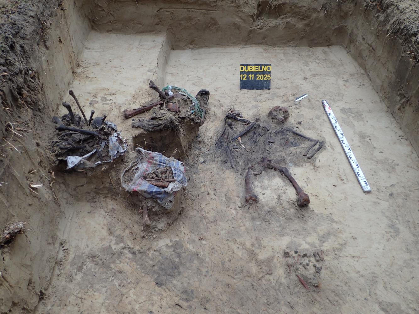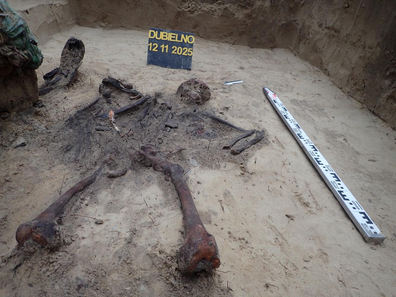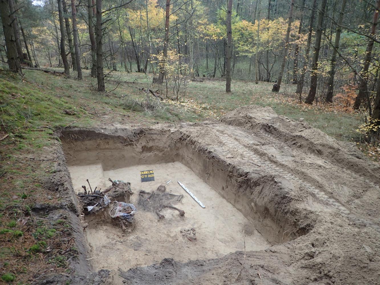 W dniu 12 listopada 2025 r. prowadziliśmy prace ekshumacyjne w pobliżu miejscowości Dubielno, gm. Jeżewo (woj. kujawsko-pomorskie). W oznaczonej leśnej mogile odkryliśmy szczątki ośmiu niemieckich żołnierzy poległych w 1945 r. Niestety większa część grobu została w przeszłości zniszczona i ograbiona. Z tego powodu udało nam się odnaleźć tylko jeden nieprzełamany znak tożsamości.