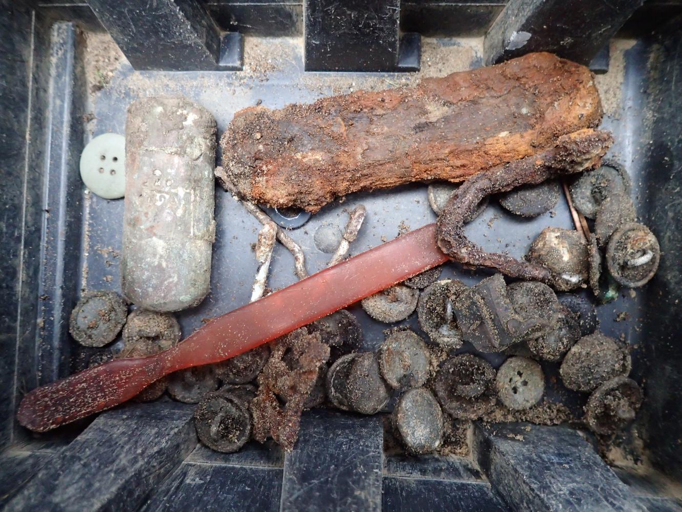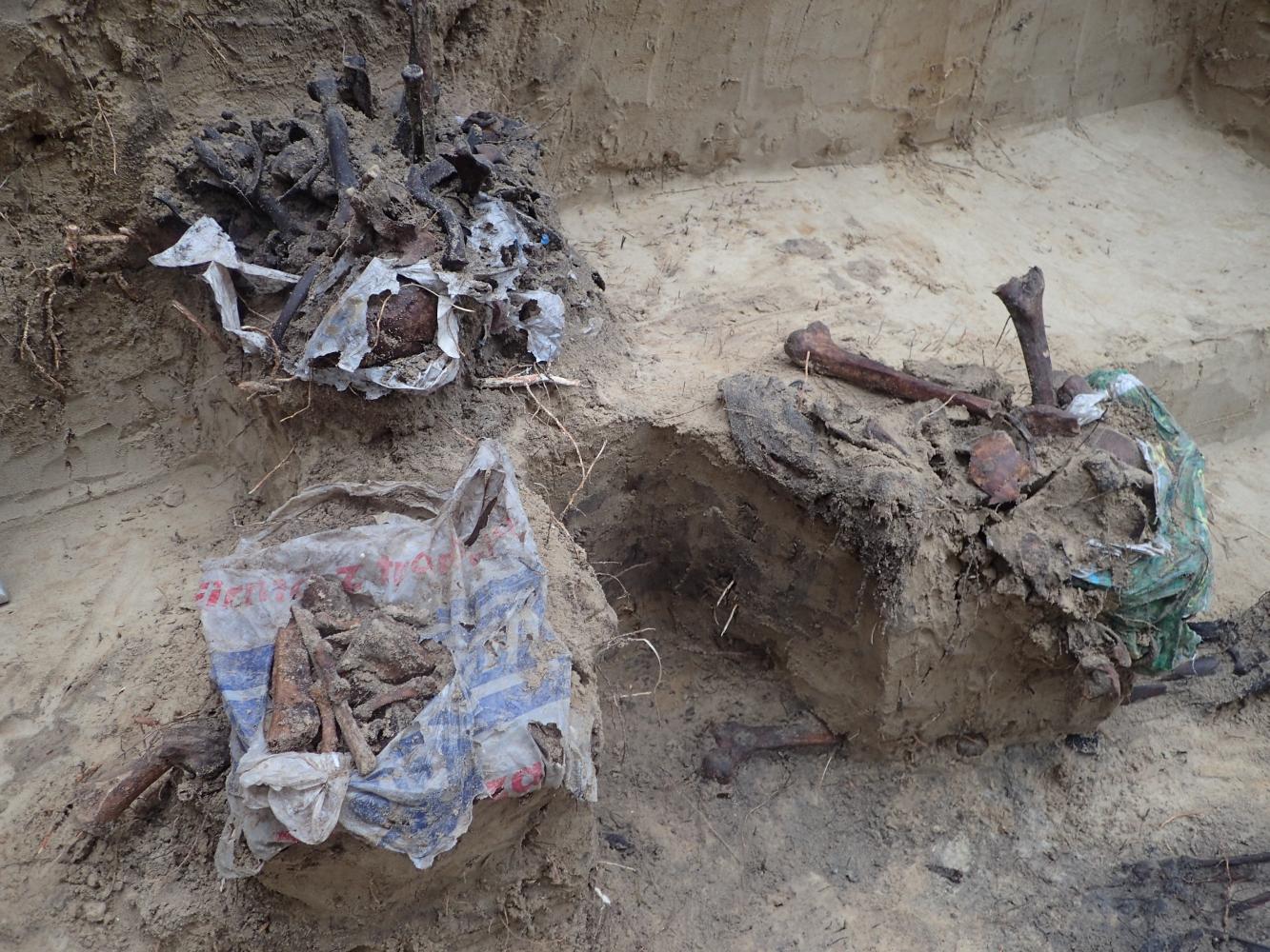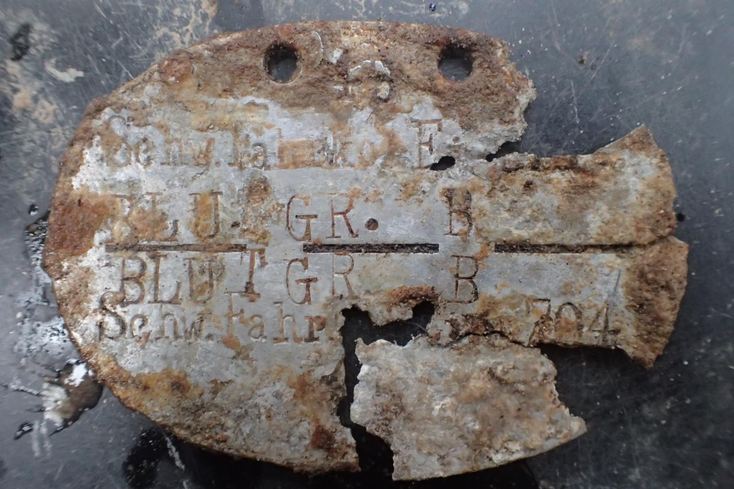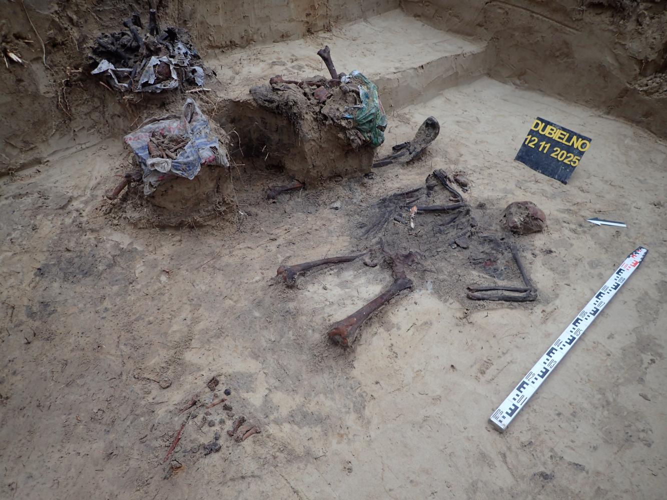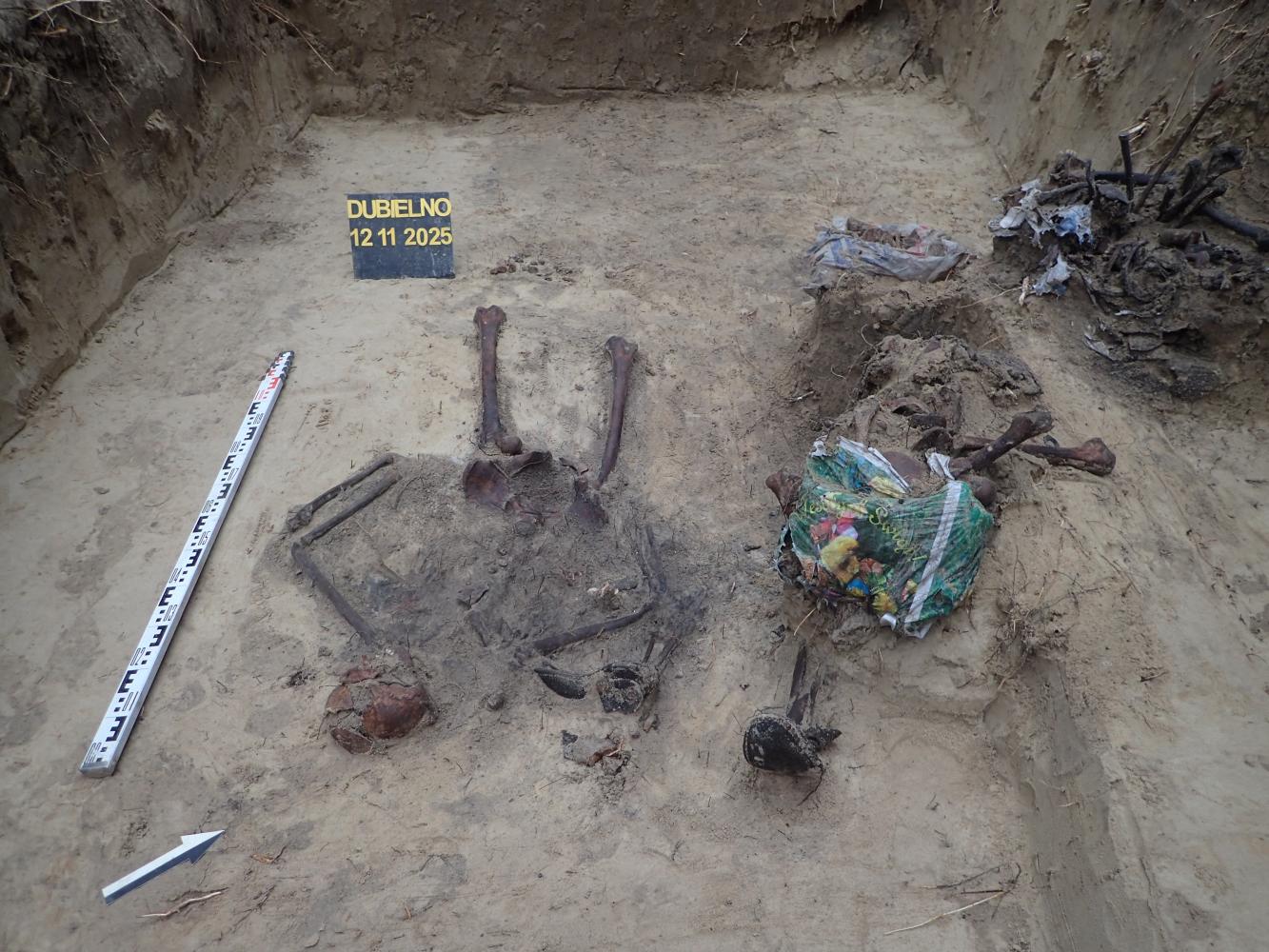 W dniu 12 listopada 2025 r. prowadziliśmy prace ekshumacyjne w pobliżu miejscowości Dubielno, gm. Jeżewo (woj. kujawsko-pomorskie). W oznaczonej leśnej mogile odkryliśmy szczątki ośmiu niemieckich żołnierzy poległych w 1945 r. Niestety większa część grobu została w przeszłości zniszczona i ograbiona. Z tego powodu udało nam się odnaleźć tylko jeden nieprzełamany znak tożsamości.