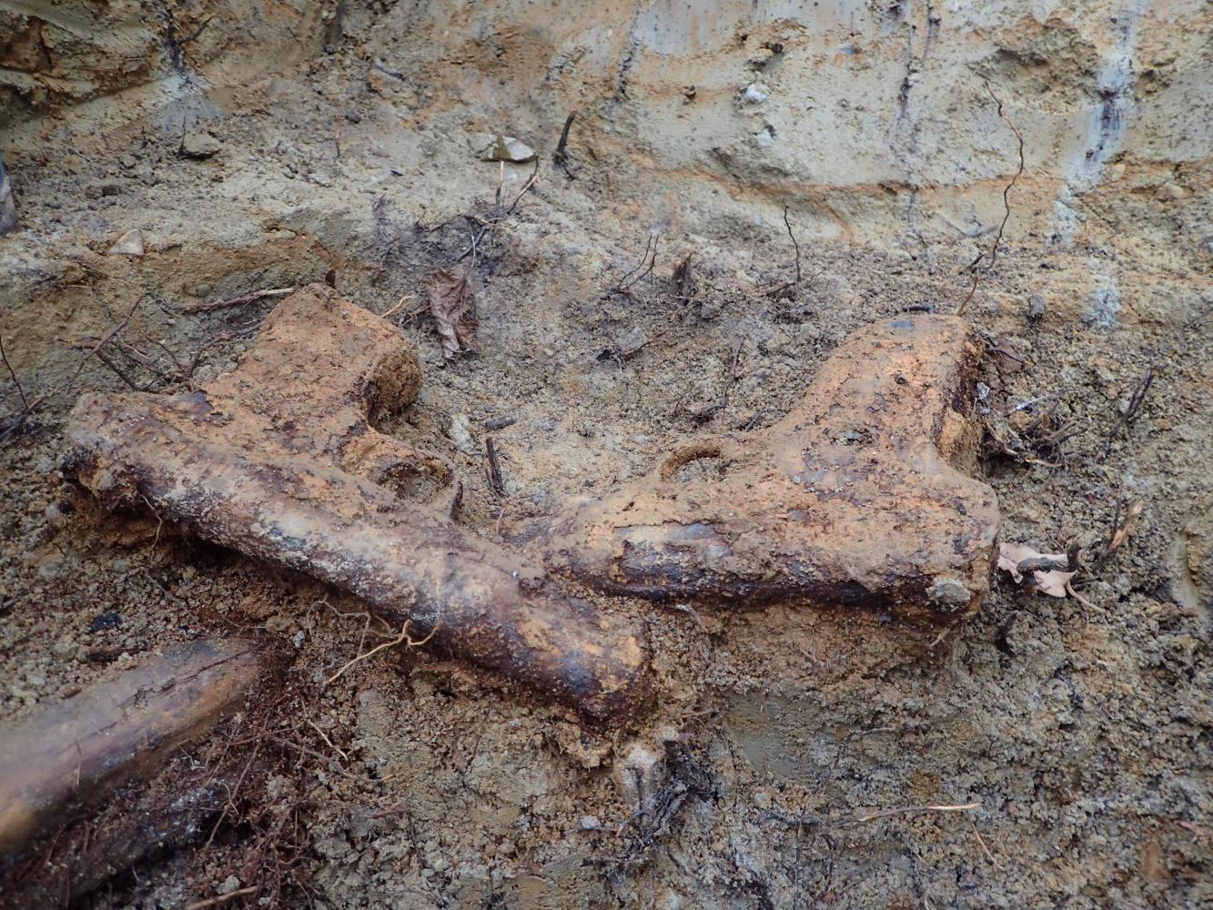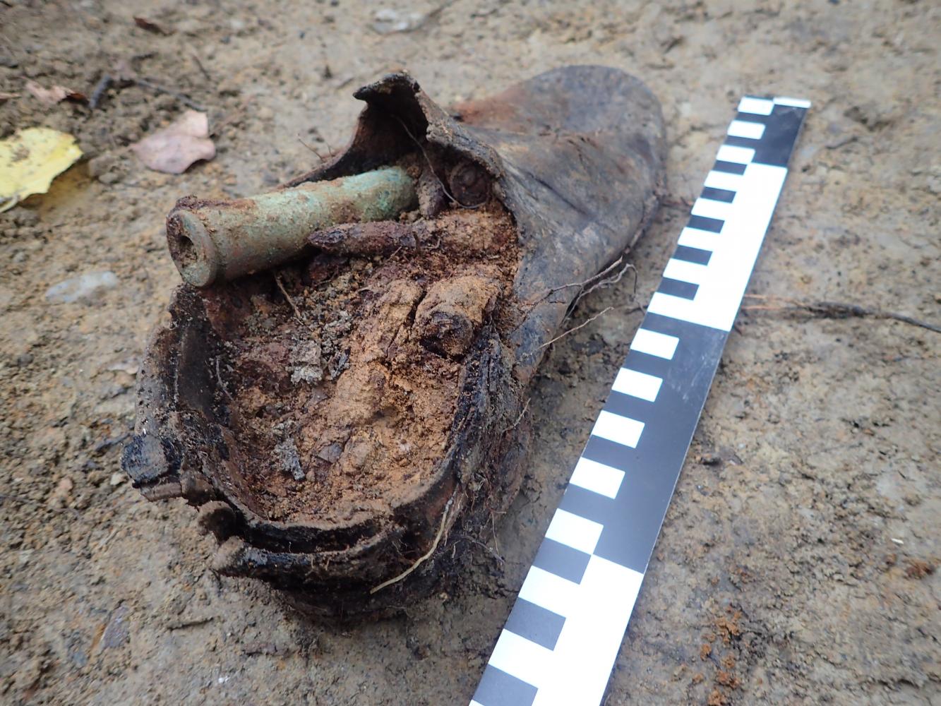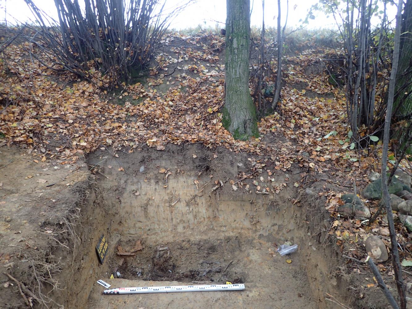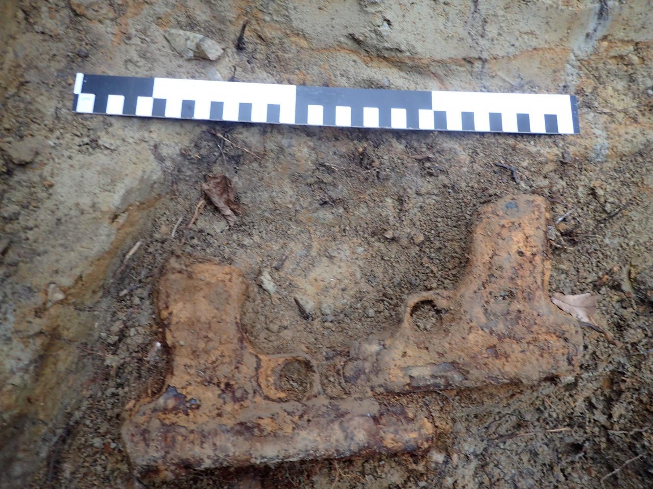 We wskazanym miejscu zarejestrowaliśmy prostokątną jamę grobową, wewnątrz której spoczywały szczątki dwóch mężczyzn. Większość zaobserwowanych kości nosiła ślady wielokrotnych złamań oraz działania ognia. Zarejestrowane przy szczątkach przedmioty jednoznacznie wskazywały, iż nie należały one do lotników niemieckich, lecz radzieckich. Wśród zadokumentowanych artefaktów były bowiem: radziecki naramiennik z miedzianym guzikiem z przedstawieniem sierpa i młota oraz dwa pistolety samopowtarzalne TT-33 (kal. 7,62 x 25 mm), stanowiącą podstawową broń krótką Armii Czerwonej podczas II wojny światowej. Ponadto w zasypisku jamy grobowej odkryto 337 sztuk amunicji kal. 7,62 x 54 mm oraz 13 sztuk lotniczej amunicji kal. 12,7 x 108 mm (częściowo w taśmach nabojowych).