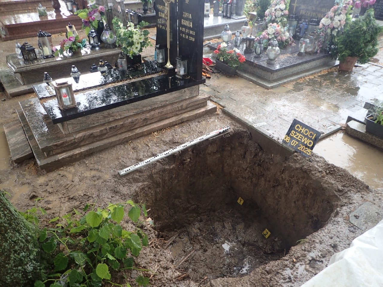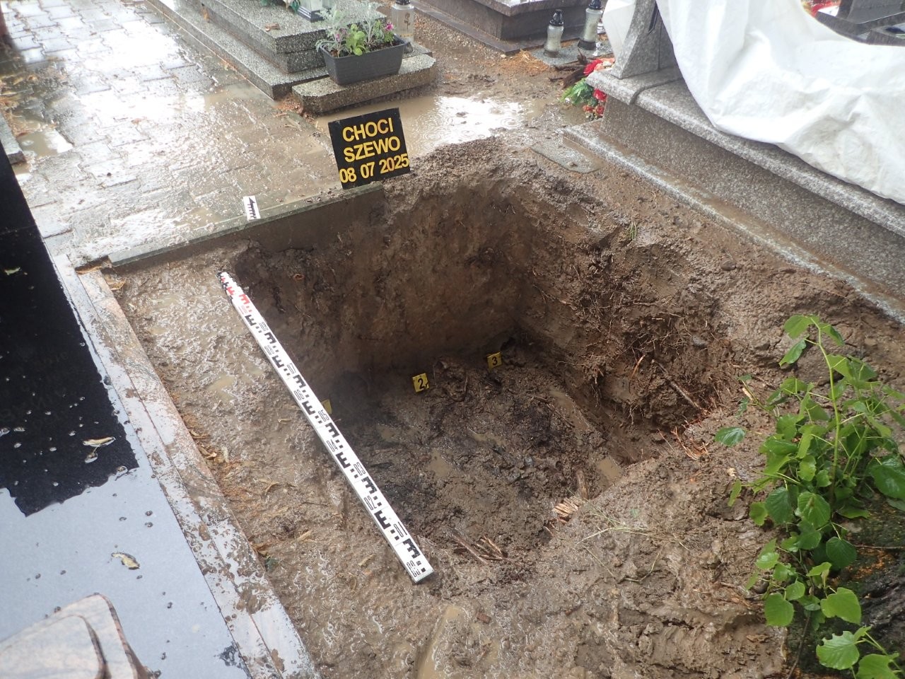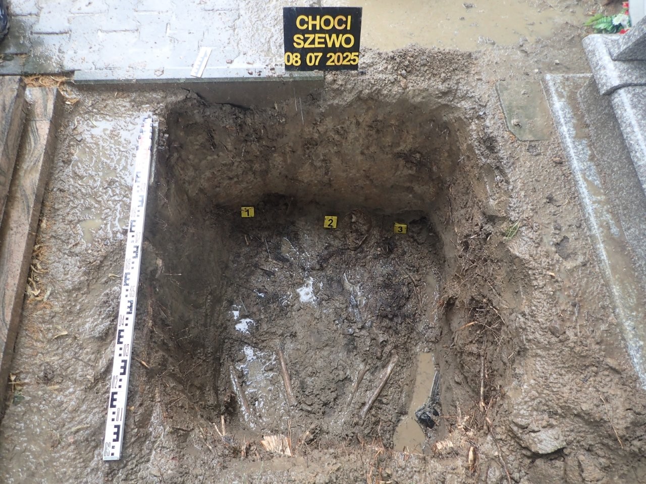 W dniu 8 lipca 2025 r. prowadziliśmy prace ekshumacyjne w Chociszewie, gm. Trzciel (woj. lubuskie). Dzięki relacji świadków oraz materiałom archiwalnym na miejscowym cmentarzu zlokalizowaliśmy grób masowy, w którym pochowano co najmniej dziewięć osób narodowości niemieckiej poległych i zmarłych w 1945 r. Niestety większa część mogiły została już zajęta przez współczesne pochówki. Jednak na dostępnej dla nas przestrzeni udało nam się odkryć szczątki czterech niemieckich żołnierzy, przy których znajdowały się dwa nieprzełamane znaki tożsamości.
