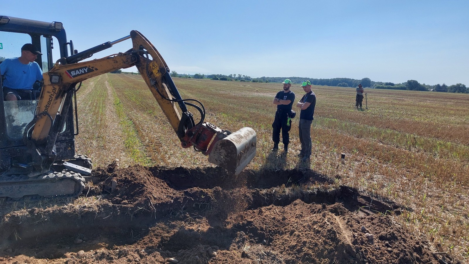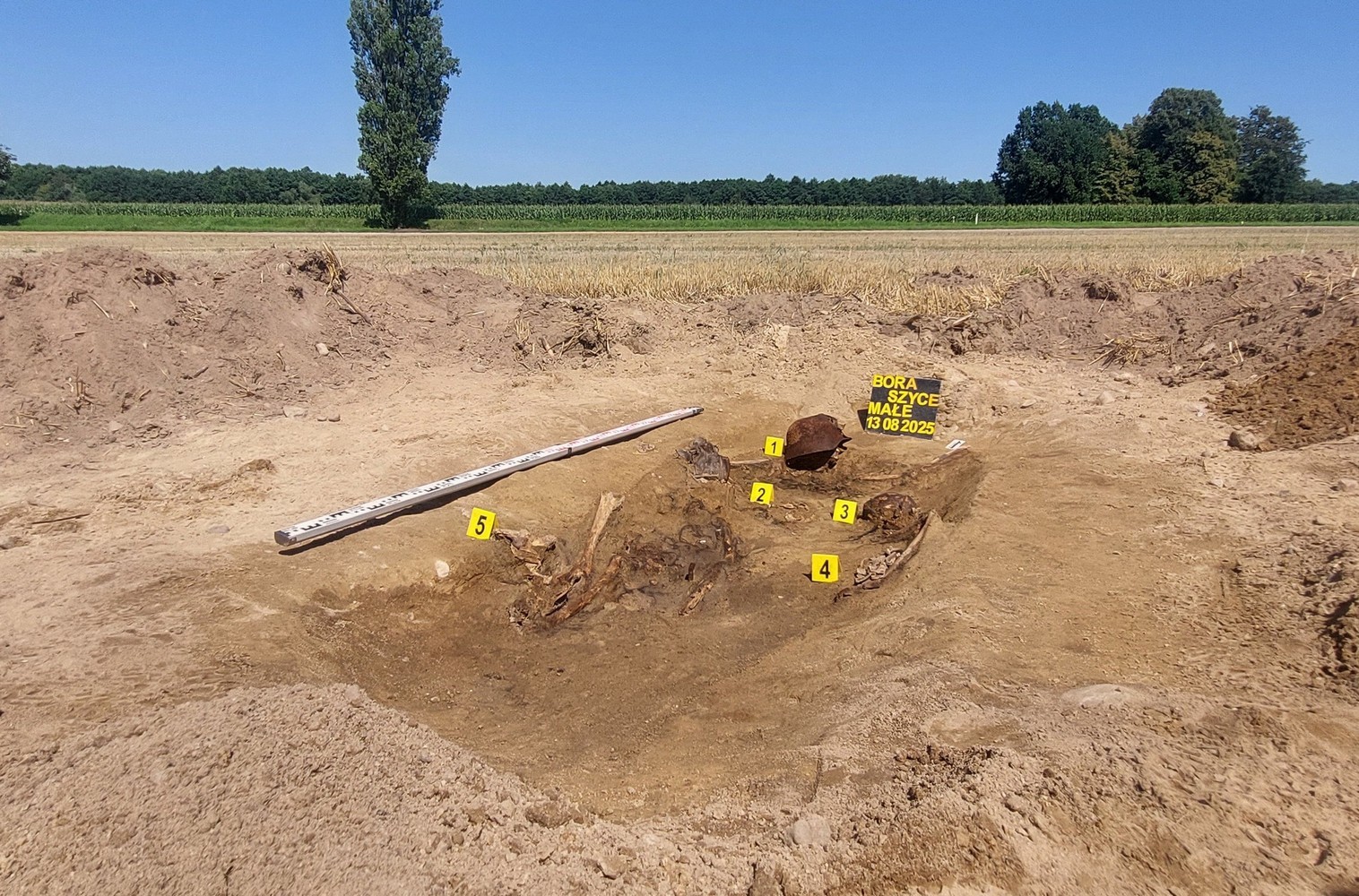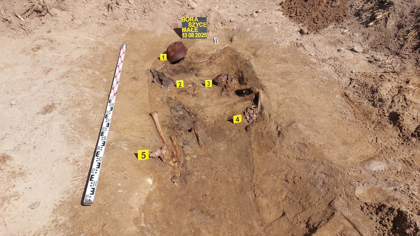 W dniu 13 sierpnia 2025 roku przeprowadziliśmy prace archeologiczno-ekshumacyjne na polu w obrębie miejscowości Boraszyce Małe w województwie dolnośląskim. Postanowiliśmy przeprowadzić badania tego obszaru, ponieważ w 2023 roku natrafiono tam przypadkowo na grób wojenny. Osoby, które wówczas odnalazły szczątki ludzkie i przedmioty im towarzyszące, zawiadomiły policję. Według służb działających na miejscu podjęto wtedy szkielety trzech osób oraz elementy ekwipunku wojskowego.